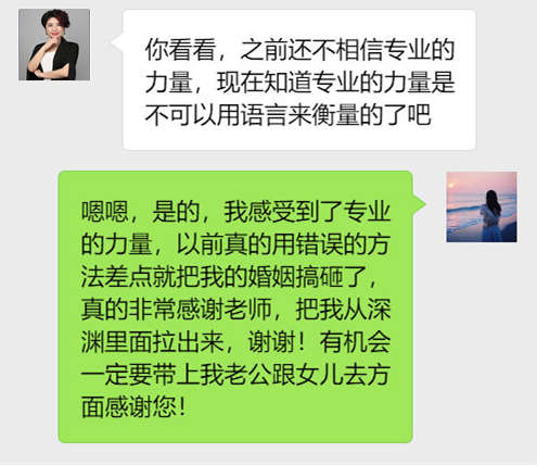 如果你(nǐ)還是不能平靜下來,那(nà)麼你(nǐ)可(kě)以尋求專業的婚姻家(jiā)庭諮詢師的幫助,專業的事情就交給專業的人(rén)去做(zuò),我會根據你(nǐ)的情況具體的分析你(nǐ)們的挽回成功率,並給你(nǐ)出一套針對於你(nǐ)的專屬方案
